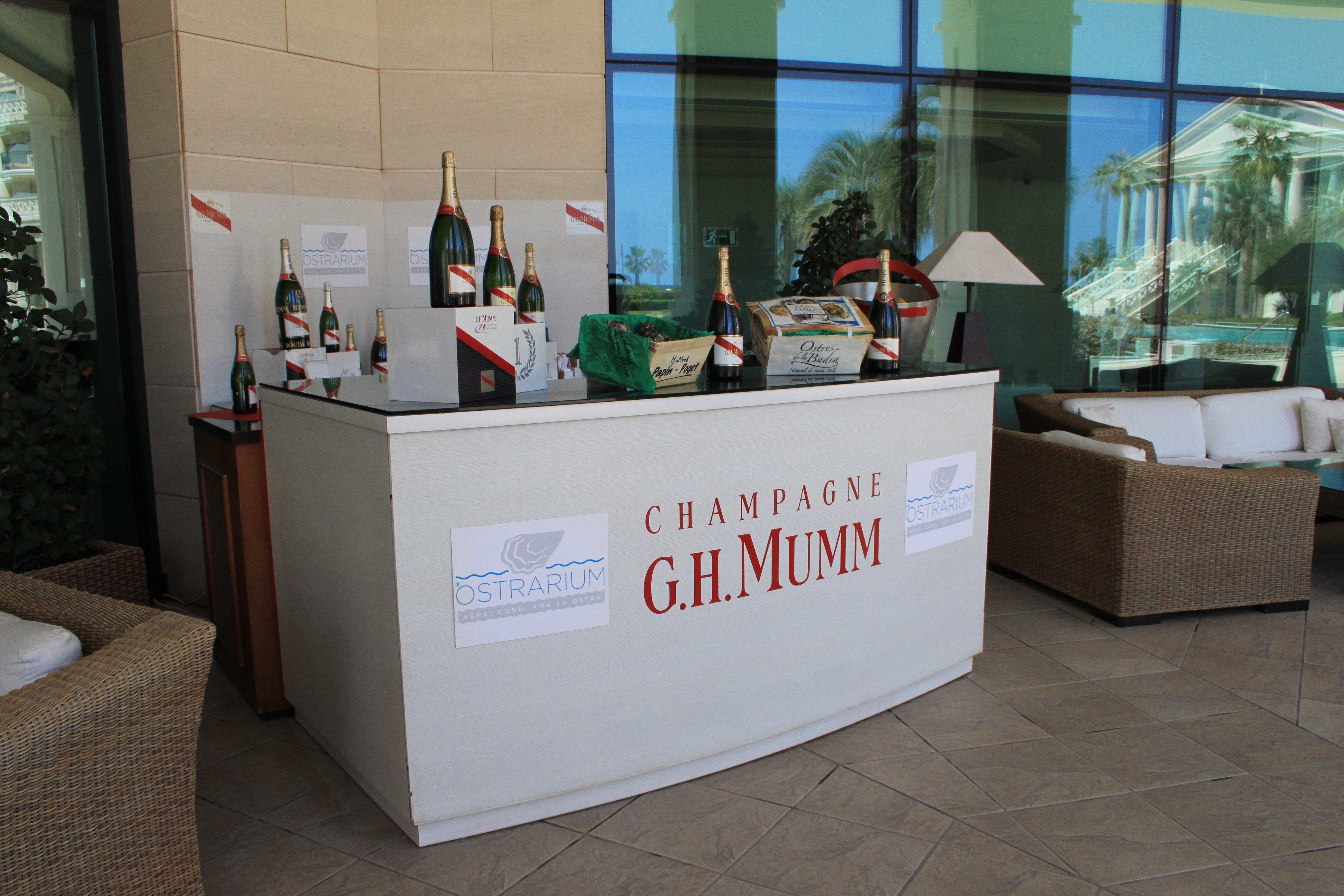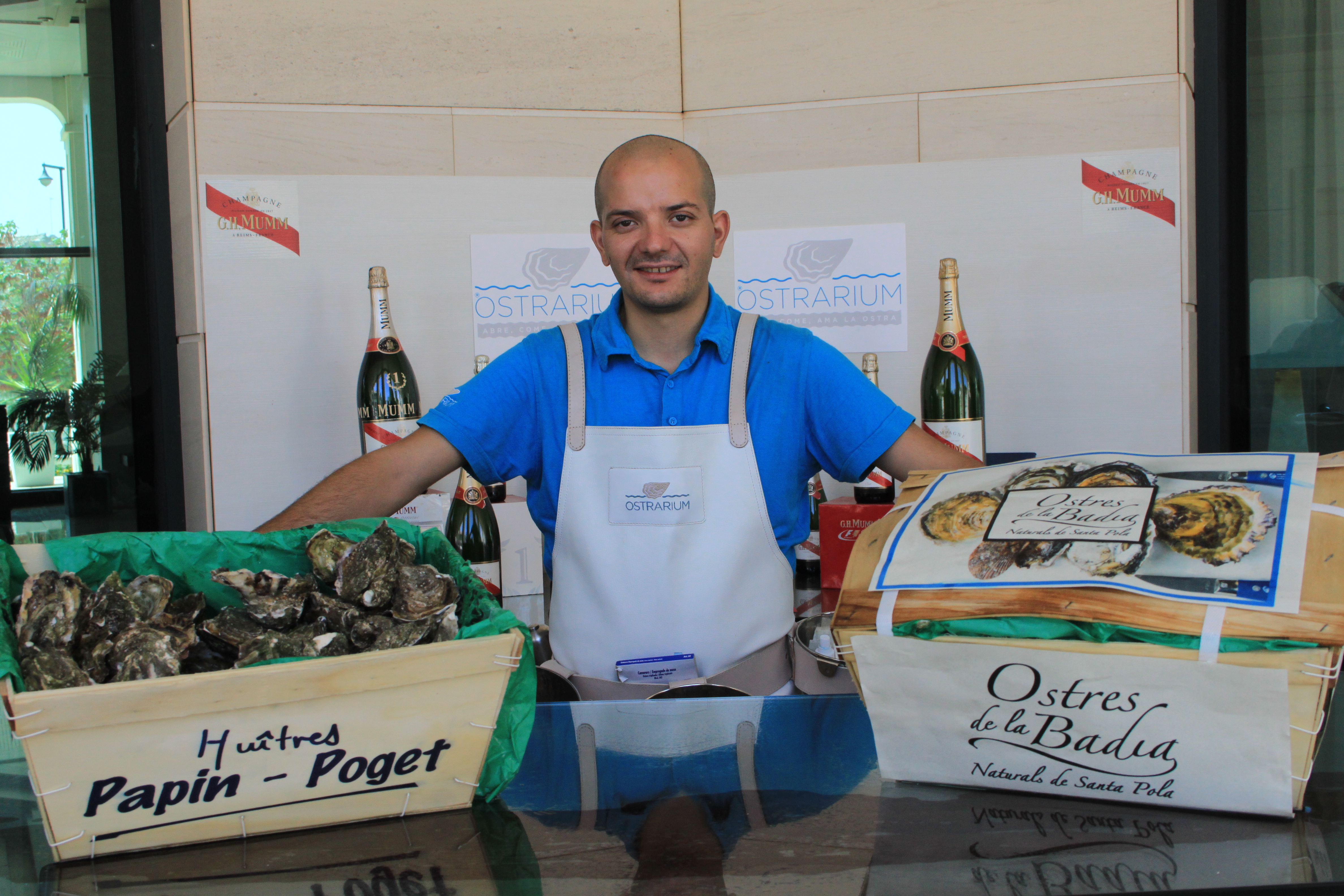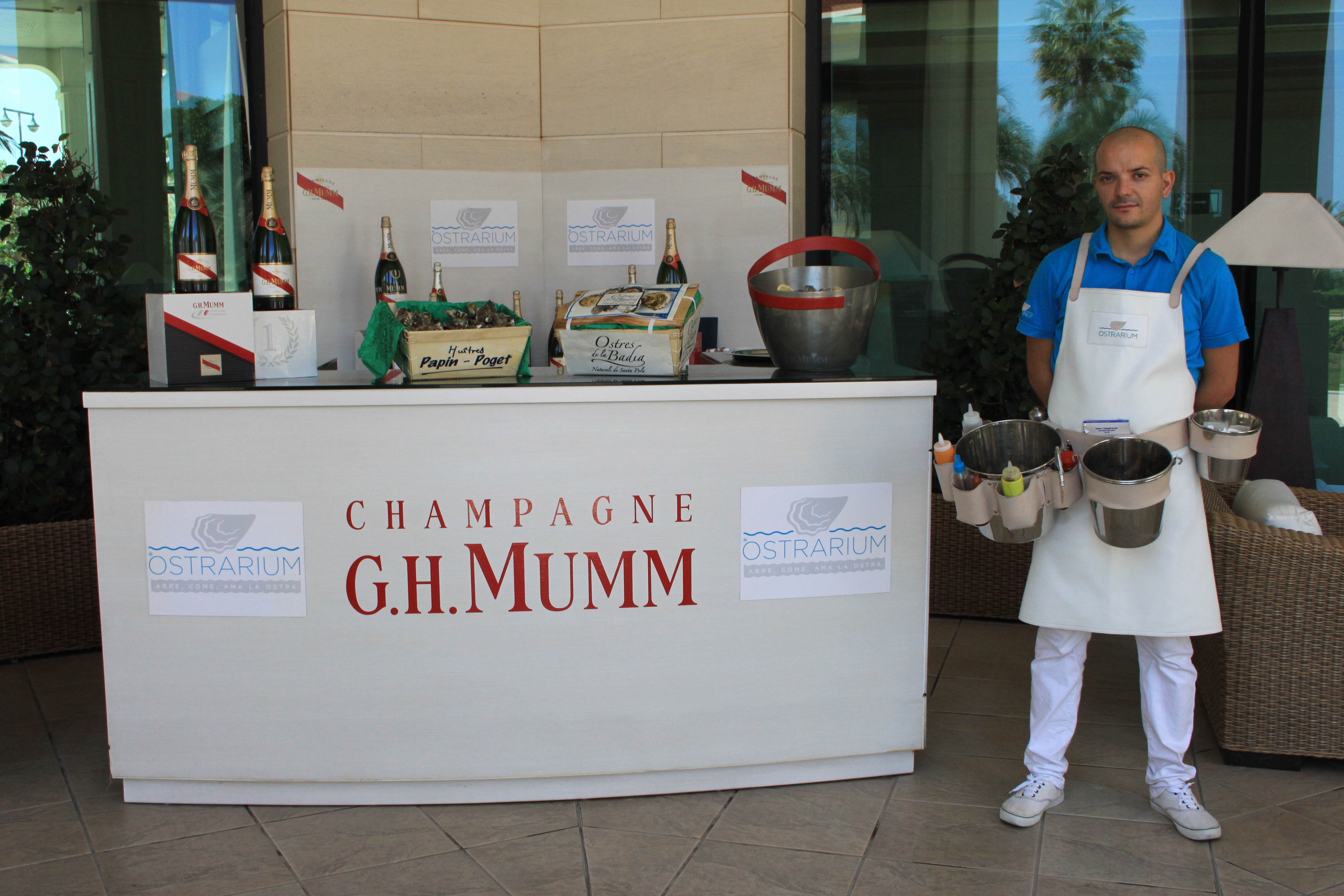 Ostras muy distintas, la exquisita y crocante de Claire de Papin Poget y la carnosa y contundente plana de Santa Pola acompañadas por champagne Mumm blanc y rosé.